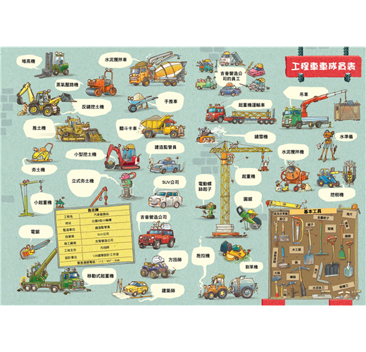 附贈「工程車車成員表拉頁海報」:撕下書後拉頁海報,照著工程車車成員表找找看e工程車們都躲在哪裡吧!