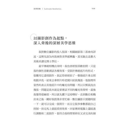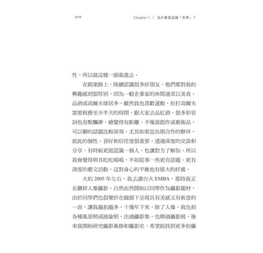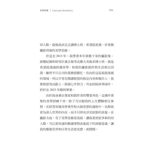 盤龍兄本身以攝影創作為起點,深入背後的深層美學思維,熱衷到甚至跑去國立臺北藝術大學(以下簡稱北藝大)美術系讀完博士學位,令我對他的熱情感到無比驚訝,他見證了一位企業家如何修煉自己的真實情況。他的經驗談自然比學院派的著作更親民而精要,他提出藝術重在實踐,而美學則範圍比藝術更廣,它探討的是人如何感受到美,以及如何豐富自己的內在。