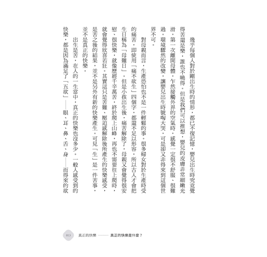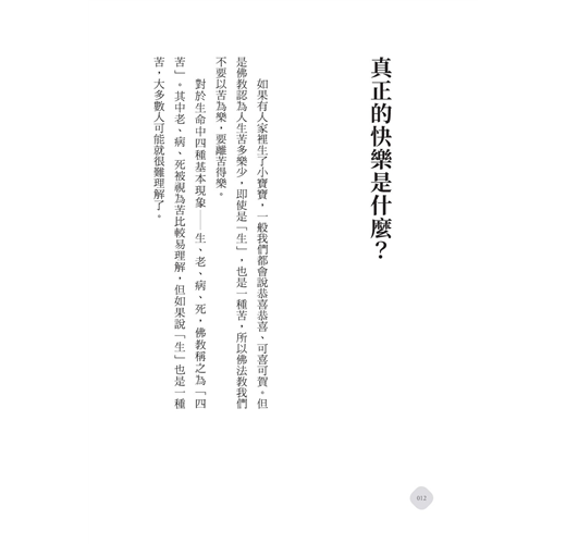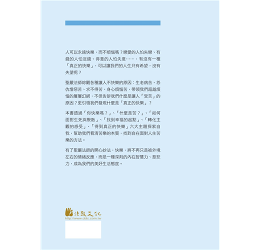 有了聖嚴法師的開心妙法,快樂將不再只是被外境左右的情緒反應,而是一種深刻的內在智慧力、慈悲力,成為我們的美好生活態度。