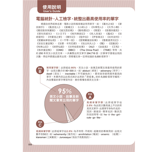 由電腦系統分析整理世界經典名著與熱門報章雜誌如:《暮光之城》、《麥田捕手》、《亂世佳人》、《蒼蠅王》、《小婦人》、《科學怪人》、《羅密歐與茱麗葉》、《達文西密碼》、《CNN》、《BBC》、《The China Post》、《TIME》等共約250本小說及文章,再人工篩選比對出使用頻率最高的單字約5,000個。每個單字皆有統計出現次數,絕無造假。培養英文能力,從單字開始;提升英文閱讀能力,從這些經典名著開始!