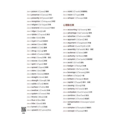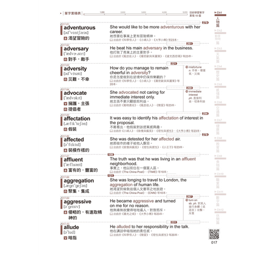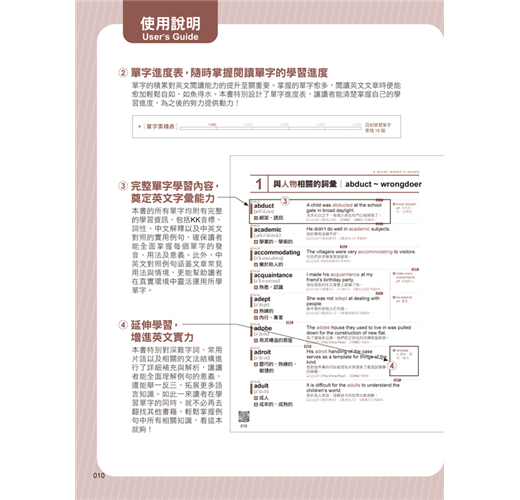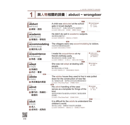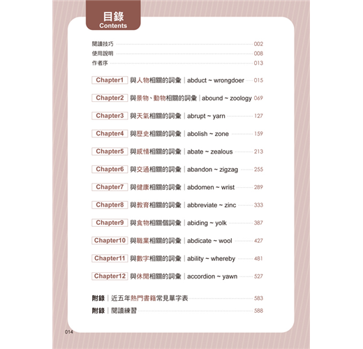 本書的單字精心規劃為12個章節,如人物、景物、天氣、歷史等,每個章節圍繞特定主題,將相關的單字整合在一起,方便讀者系統性地學習。透過同類主題的聯想方式,讀者可以舉一反三,將新單字與已有的知識點相連結,進一步加深記憶效果。同時,為了提升便利性,每個章節中的單字都以字母順序排列,方便查找,讓學習過程更高效、更有條理,減少記憶的壓力,達到事半功倍的效果。