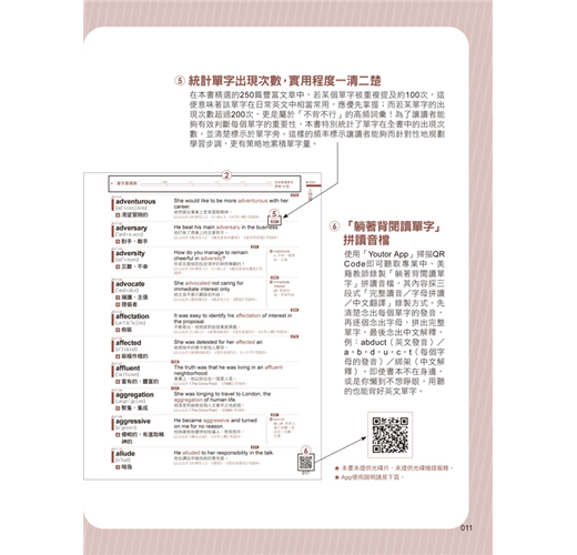 在本書精選的250篇豐富文章中,若某個單字被重複提及約100次,便代表該單字在日常英文中相當常用,應優先掌握;而若某單字的出現次數超過200次,更是屬於「不背不行」的高頻詞彙!為了讓讀者能夠有效判斷每個單字的重要性,本書特別統計了單字在全書中的出現次數,並清楚標示於單字旁。這樣的頻率標示讓讀者能夠而針對性地規劃學習步調,更有策略地累積單字量。