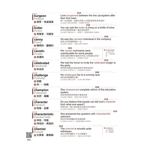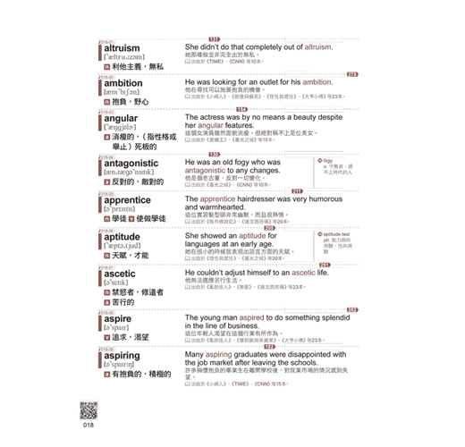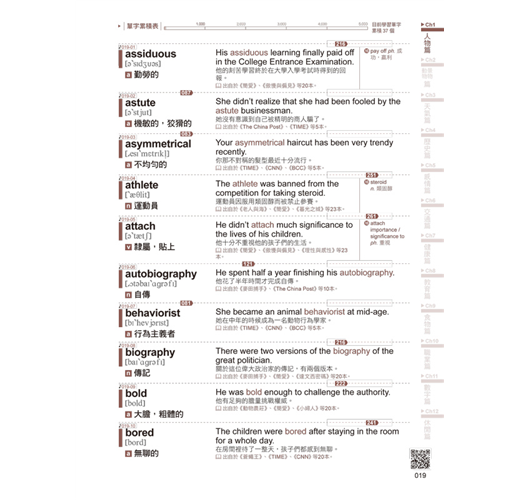 本書的所有單字均附有完整的學習資訊,包括KK音標、詞性、中文解釋以及中英文對照的實用例句,確保讀者能全面掌握每個單字的發音、用法及意義。此外,中英文對照例句涵蓋文章常見用法與情境,更能幫助讀者在真實環境中靈活運用所學單字。