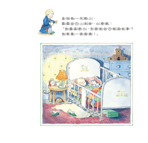 從前,有一個孤獨的小寶寶沒有媽媽——但他非常想要一個媽媽。他决定帶著行李箱,自己出門去尋找。在途中,他遇到了貓、泰迪熊、發條母雞和許多新朋友,雖然他們都不能成爲他的媽媽,但每個都想幫助他。