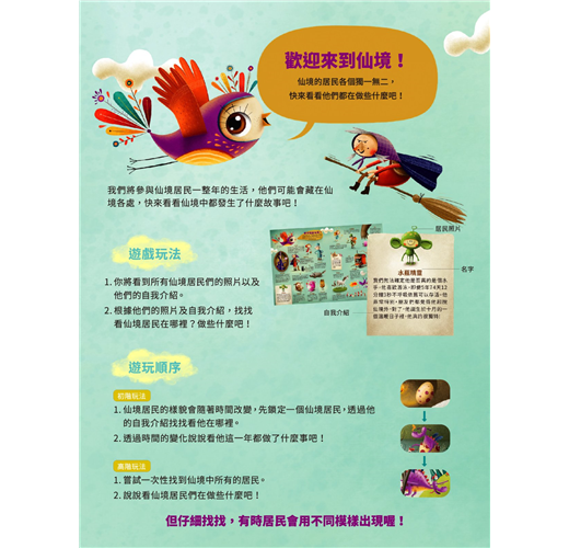 附贈「仙境居民表拉頁海報」:撕下書後拉頁海報,照著仙境居民表找找看仙境居民們都躲在哪裡吧!
