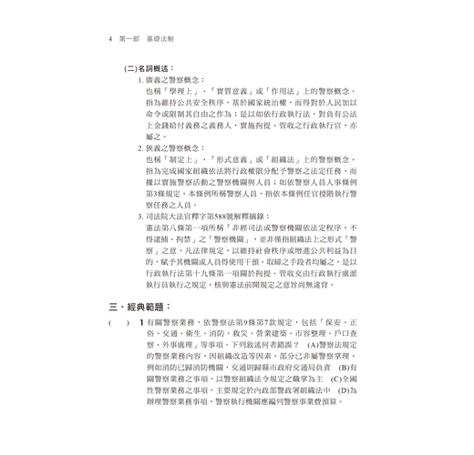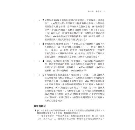 除了平時的努力、熟讀課本內容外,最重要的是考古題的練習,以增加臨場的經驗,本書收錄112~113年警察特考、一般警察、警佐、警二技、警正、警大等相關試題。所有試題均有詳細精闢解析,免去另外翻閱及查找資料的麻煩。藉由這些考古題可以理解考試的重點與脈絡,如此一來,在考場上更能得心應手,獲取高分﹗