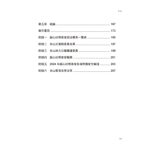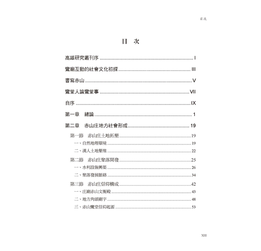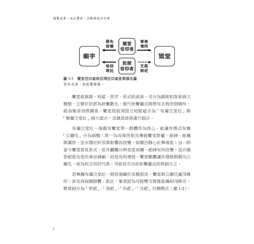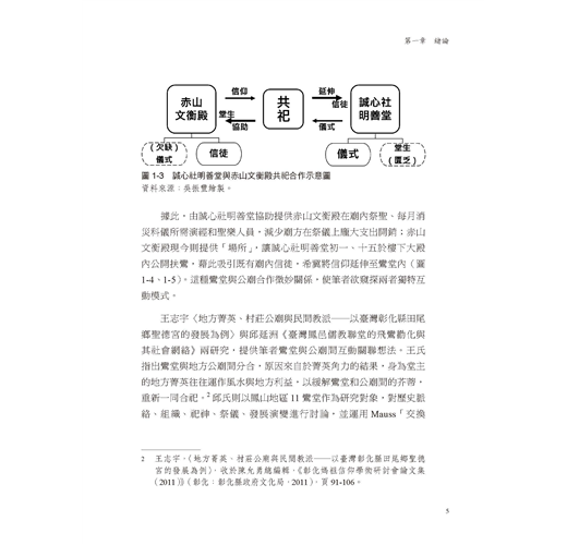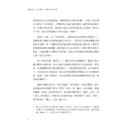 全書首先深入探討赤山地區的地方史,並剖析赤山庄的聚落、家族與民間信仰等面向,勾勒赤山庄的三大角頭及重要家族的社會與空間構成,梳理各角頭廟和公廟的信仰系統,釐清公廟文衡殿的廟產和歷史演變等;特別是後者,日治末、戰後初這段時間,赤山文衡殿受到寺廟整理運動、教化助成會強制徵收,導致香火中斷多年,廟內幾呈荒廢樣貌。這些勾勒,鋪陳了創設於1954 年的誠心社明善堂的地方社會背景,為「鸞廟互動」釐清文化基礎。