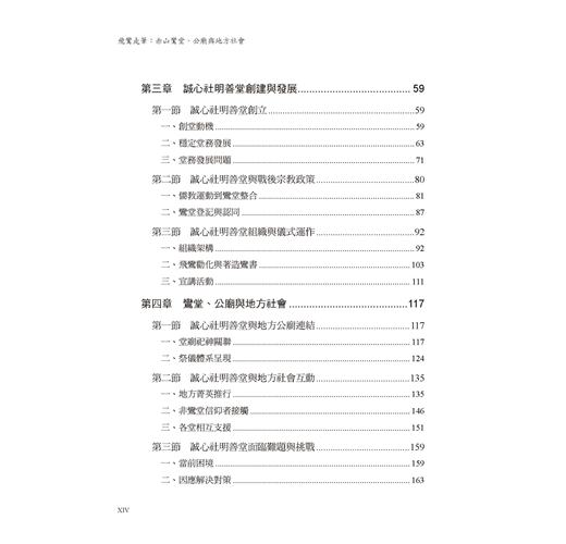 書內主要採用「參與觀察」,輔以文獻分析解讀。先梳理赤山庄聚落歷史脈絡和地方信仰構成,鋪陳地方社會整體背景,釐清誠心社明善堂創堂緣由與發展過程,分析「鸞堂與公廟」如何有所互動、連結,進而深入至地方社會,試圖從「信仰」與「儀式」兩大方向切入。