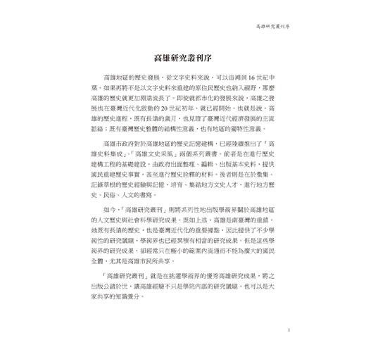 如今,「高雄研究叢刊」則將系列性地出版學術界關於高雄地區的人文歷史與社會科學研究成果。既如上述,高雄是南臺灣的重鎮,她既有長遠的歷史,也是臺灣近代化的重要據點,因此提供了不少學術性的研究議題,學術界也已經累積有相當的研究成果。但是這些學術界的研究成果,卻經常只在極小的範圍內流通而不能為廣大的國民全體,尤其是高雄市民所共享。