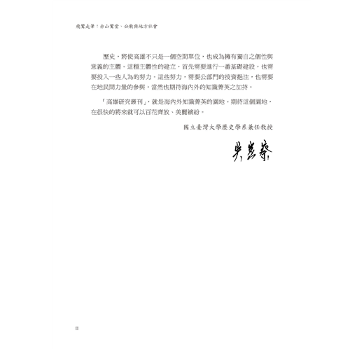 「高雄研究叢刊」,就是海內外知識菁英的園地。期待這個園地,在很快的將來就可以百花齊放、美麗繽紛。
