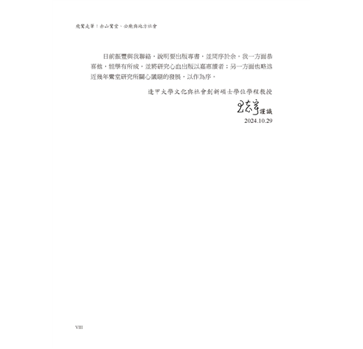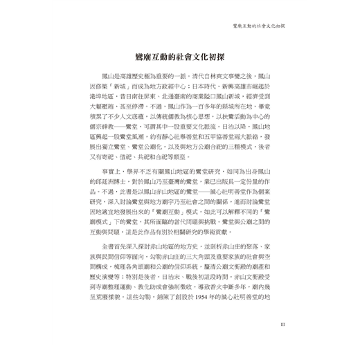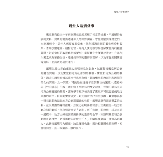 振豐以鳳山赤山庄誠心社明善堂為對象,試圖釐清鸞堂與公廟的屬性問題,以及鸞堂和地方社會間的關聯。鸞堂和地方公廟的關係,過去江趙展也曾以淡水行忠堂為例,討論鸞堂的教派化和民間信仰化的問題。此一問題,可說是在近幾年受到關注的議題。民國90年《竹山鎮志》出版,我記錄了克明宮的歷史發展,並指出該宮有向地方公廟發展的趨勢,部分學者私下曾表達了鸞堂不可能發展成地方公廟的看法。目前的鸞堂研究,對此種看法已有所改觀,鸞堂應具有一種在民間教派與地方公廟間擺盪的性質。振豐此研究透過豐富的史料,並以嚴謹的邏輯推理,以誠心社明善堂和赤山文衡殿此一地方公廟之間的關係,指出明善堂從「寄祀」到「共祀」的發展,以及在此一過程中,地方士紳在該堂所扮演的重要角色等,來證明鸞堂和公廟間的可結合性,更透過地方社會中「人」的關係及網絡,擴張其影響力。此研究振豐用力極深,論述邏輯也強,對於相關歷史的詮釋,相當地到位,是一本值得一讀的佳作。