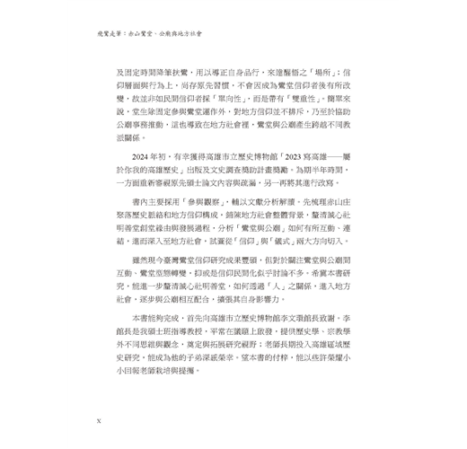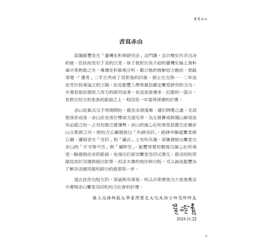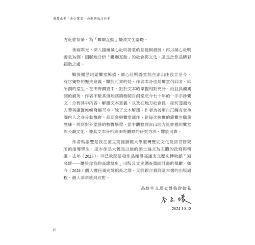 作者吳振豐是我在國立高雄師範大學臺灣歷史文化及語言研究所的指導學生,這本作品大體是以他的碩士論文為主體的改寫與精進。去年(2023),早已欣聞這項作品獲得高雄市立歷史博物館「寫高雄──屬於你我的高雄歷史」出版及文史調查獎助計畫的獎勵,如今(2024)個人擔任高史博館長之際,又能親自看到這本書的出版過程,個人深深感到欣慰。
