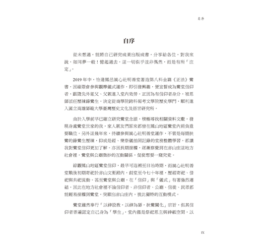 此外,特別向誠心社明善堂堂內諸位恩師頂禮,身為堂生受到恩師們庇佑與眷顧,方能在收集文獻與撰寫本書過程中,將所有疑難、瓶頸逐一突破;再加上今年適逢誠心社明善堂創堂七十週年,希冀本書出版,能讓大眾更了解鸞堂信仰。