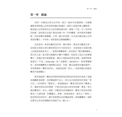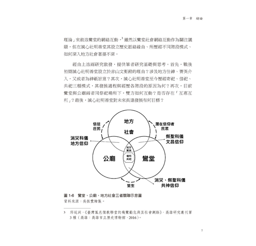 雖然現今臺灣鸞堂信仰研究成果豐碩,但對於關注鸞堂與公廟間互動、鸞堂型態轉變,抑或是信仰民間化似乎討論不多。希冀本書研究,能進一步釐清誠心社明善堂,如何透過「人」之關係,進入地方社會,逐步與公廟相互配合,擴張其自身影響力。