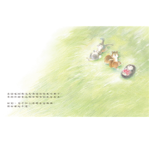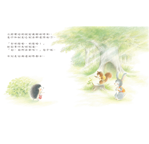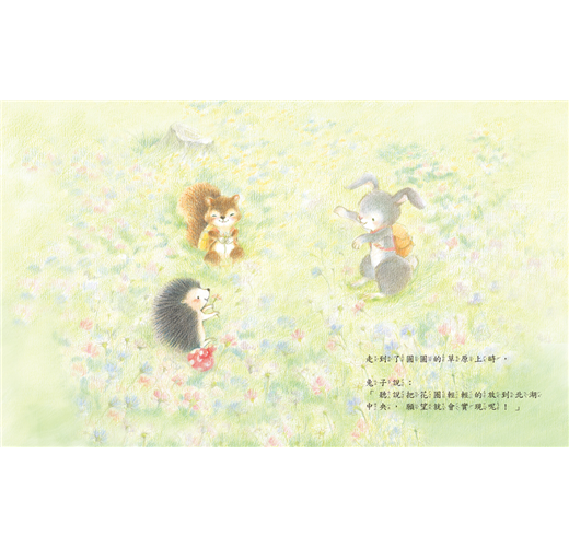 小刺蝟、兔子和松鼠今天一起野餐。他們到了傳說可以實現願望的湖泊,各自許下願望。回家的路上,大家開始分享願望。
