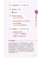 本書涵蓋旅行時會遇到的各種情境,分成8大主題。從行前安排、旅遊相關諮詢及訂機票等,到搭機、住宿、餐飲、交通、購物、娛樂活動及旅遊時的各種突發狀況,共40個單元。每個單元從旅人必備詞彙開始,搭配旅行在外好用句,讓人知道學了單字該怎麼使用。實用對話模擬了旅遊情境,並附上真人實拍影片,線上掃描就能看,好用又方便。對話裡的關鍵單字和口語、片語,一併收錄在其簡單要說明舉例。最後的旅人加油站,提供更多有趣實用的相關資訊,讓你在輕鬆閱讀之餘也能順便學到小知識。