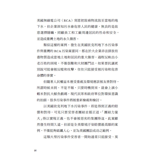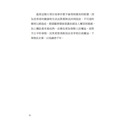 許多事件原本可以透過企業的良善管理與政府的有效監督來避免,但現實往往是企業看準「有錢就是任性」,等到出事後才動用龐大律師團「和解」,最終受害者只能被迫接受不公平的結果。