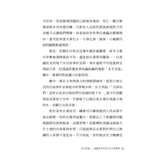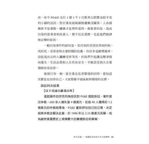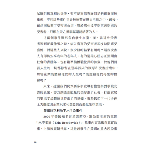 同時,提醒我們不要忘記書中不幸的案例,在未來如何能夠避免並讓消費者享有安全生活和環境的權利,企業經營一定要獲利才能夠永續經營,但同時要有保障消費者的義務和良知。