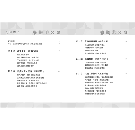 這本書就是那個工具箱,系統化列出、分類和解釋所有跨領域的重要心智模式。在9個章節裡,以敘述的方式替你把所有的超級模式組織起來,希望讀起來有趣,並且容易理解。每個章節都有一個貫穿的主題,書寫的方式也方便日後回頭參看。