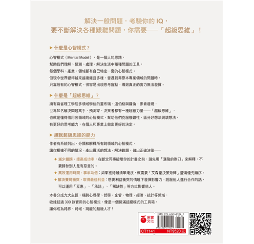 「巴菲特的合夥人查理.蒙格曾說:『心智模式就是大腦做決定時所使用的工具箱;工具箱裡有的工具愈多,你就更有可能做出正確的決定。』而在這本書中,你可以找到超過三百多個在日常生活中被反覆利用的經典工具。」──劉奕酉,《高產出的本事》作者、商務顧問