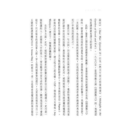 最可貴的是,本書介紹了羅素.克洛所演出的每一部電影,以及羅素對他所飾演的角色的揣摩過程,呈現了他敬業且專業的一面。想一窺鏡頭後有趣的花邊軼事,一定不能錯過此書。