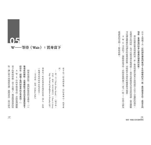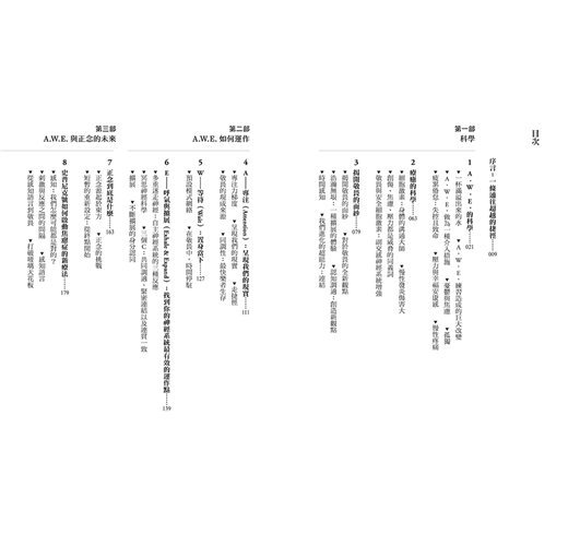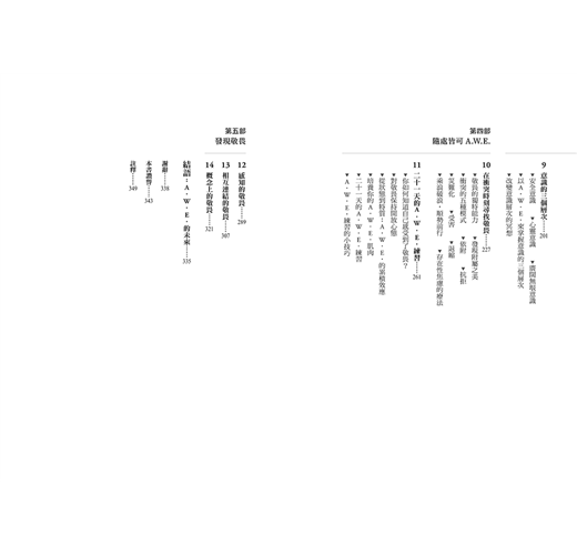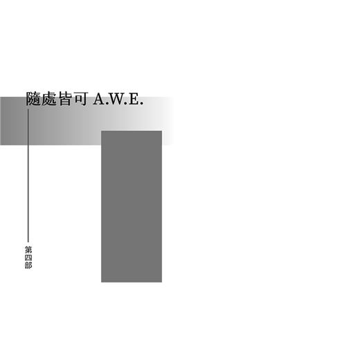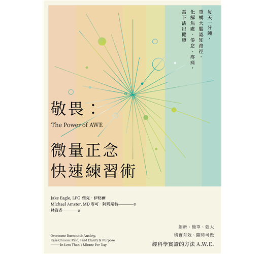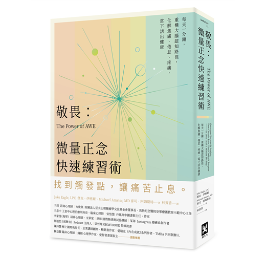 敬畏——A.W.E.,又稱微劑量正念(microdosing mindfulness)練習法,被譽為正念的未來。A(Attention)代表注意力,W(Wait)是等待,E則是呼氣和擴展(Exhale & Expand)。只要一分鐘、三步驟過程,可以讓思維重新被引導建構,產生高度增強的意識狀態;接著,情緒也被重置,開始反轉身心受困的現狀。無論何時何地,只要願意練習,隨時可進入,感受健康與美好。
