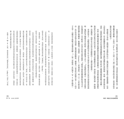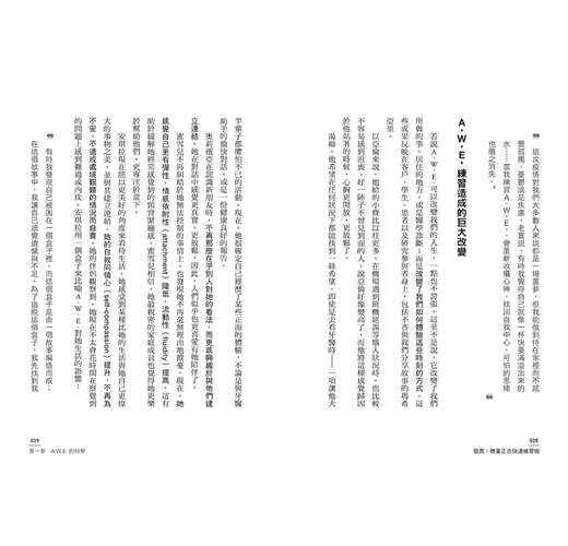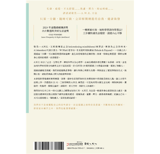 A.W.E.綜合了正念、生物化學、神經科學以及心理學,由兩位權威作者花費數十年探索、研究,並在加州大學柏克萊分校研究支持下展現成果,於COVID-19期間累積了大量臨床經驗,幫助了無數人。