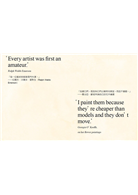 「我一直認為,畫室的光線與色彩對我的創作影響很大。我最初是在一個裝飾著黑色飾板的畫室裡作畫。然後是在布魯塞爾的畫室,周圍都是明亮的紅色。在倫敦,我是在淡綠色調的影響下創作。我在羅馬過冬的時候,則嘗試白色畫室的效果。至於現在,您看得出來,我的畫室以銀白色調為主,我認為這最符合我當前的藝術氣質。」