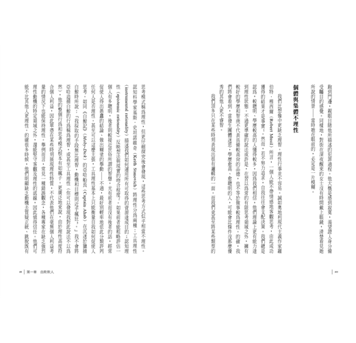 我們頂多只在某些時刻表現出很有邏輯的一面。而我們竟甚至將某些類型的思考模式稱為理性,但更仔細探究後會發現,這些思考方式似乎相當不理性。認知科學家基斯.史坦諾維奇(Keith Stanovich)將理性分為兩種:工具理性(instrumental rationality)描述我們如何運用所有可取得的資源達成目的;認知理性(epistemic rationality)反映想法與現實的吻合程度2。如果前者能粗略評估一個人有多聰明,後者則較接近世俗所謂的智慧,光有前者而沒有後者的話,經常促使人得出愚蠢的結論、做出糊塗的舉動——不過,最好別輕率地依此分類評判任何人是否理性。甚至可以這麼主張,工具理性基本上只能衡量自我如何促使人思考。如同《白鯨記》(Moby-Dick)的亞哈船長(Captain Ahab)在沉迷於獵捕白鯨時所說:「我採取的手段無比理智,動機和目標則近乎瘋狂。」