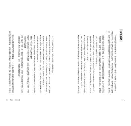 在最後三章中,我會更聚焦探討政治和現今民主面臨的威脅。第六章將回顧歷史上對於自由、民主和治理的概念,文中會提到專制威權和革命的幾種風險和規律。接著,我會點出社群媒體時代的幾項政治特色,包含團體權利抬頭所帶來的影響,以及政治理論和實務間的平衡。外交政策應符合國家利益,以獲得人民支持,但很多時候並非如此。我們似乎倒退到馬基維利主義出現前的時代,任由理想形塑對外的國際政策,不顧現實情況。我們是否正在走向反烏托邦的未來?