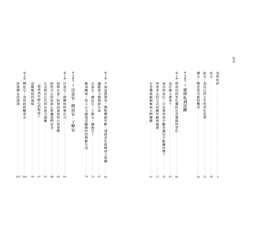 「一旦我們明白自身的想法和情緒既交織難分,卻又各自獨立,便可以憑意志選擇去釐清散漫的思緒,不再糾結於自身遭遇,而是留意自己想要什麼。老年是現代社會的重擔,卻也是探索正念的好理由,因為正念能讓我們達到更大的滿足。貝莉特詳細提及每一項老年所需的技能,讓讀者以更多的覺察、接納與自我疼惜,來邁向老年。」──麥凱拉.巴特爾斯(Micaela Bartels),荷蘭「贊成老運動」PR:OUD的發起人