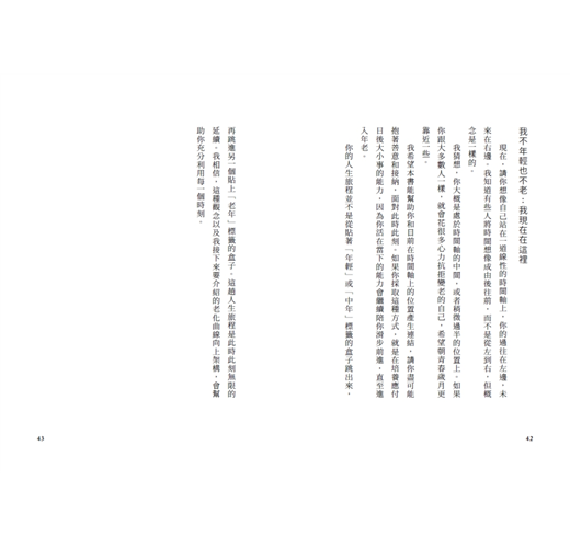 我還年輕,面對全然不同的人生風景:我強壯健康,變老是別人的事。我若覺得累,那是因為兩個年幼的孩子半夜吵醒我。我不明白為什麼變老很討厭。我覺得未來光明燦爛,值得期待。但這句話打動了我。