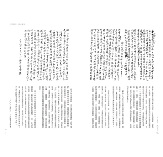洛夫以毛筆書寫方明詩作,筆墨之間流露對詩書藝術的追求與理解:「作為一個詩人兼書法家,我追求的是一個二元合一的整體世界,我企圖以書法藝術來表達我的詩情詩意,以詩情詩意來提升我的書法境界,以期達致二者完美的結合。」