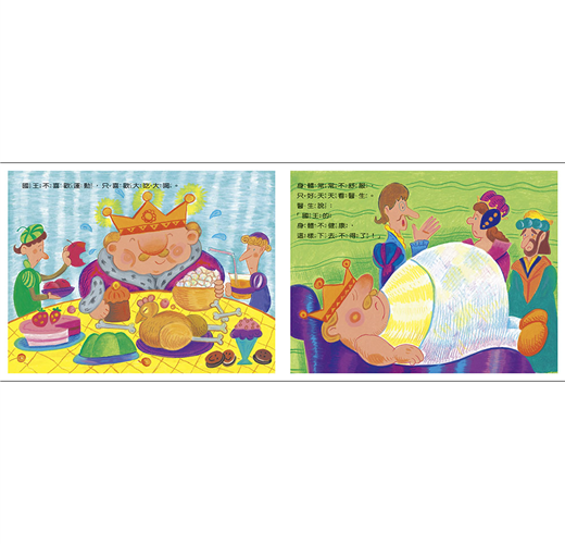 胖國王不喜歡運動,只愛大吃大喝,胖得沒辦法彎腰綁鞋帶;走快一點就會汗流浹背、大口喘氣;開會開到一半,還會累到睡著!他常常覺得身體不舒服,也想瘦下來,只是該怎麼做呢?