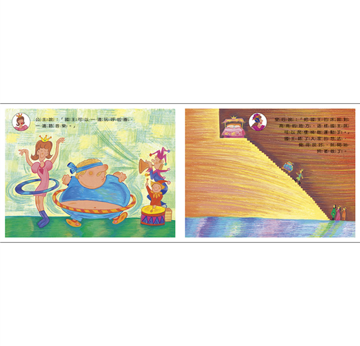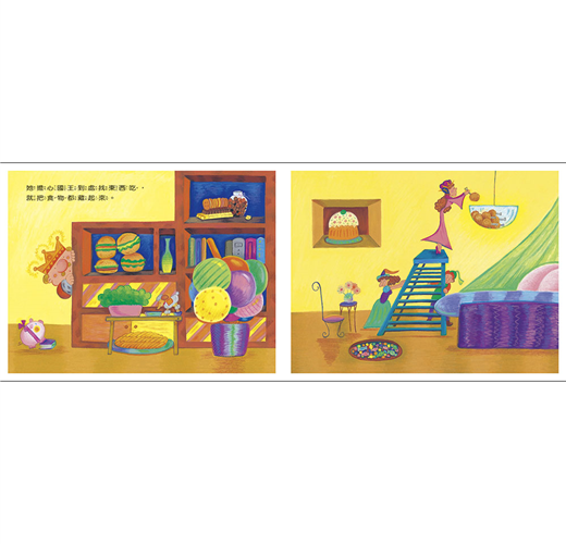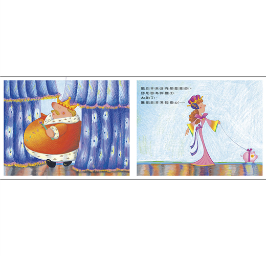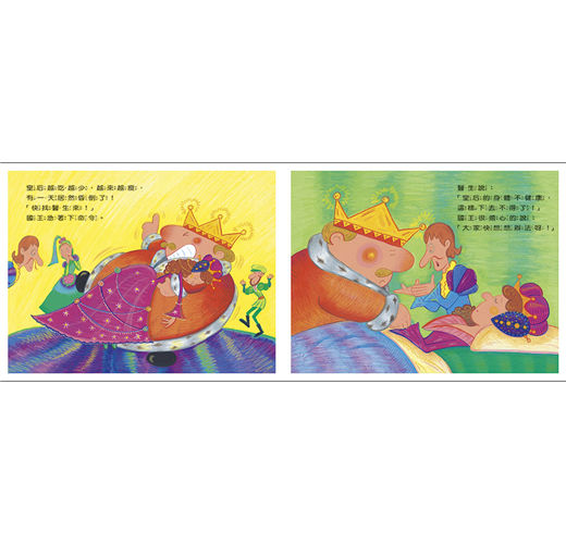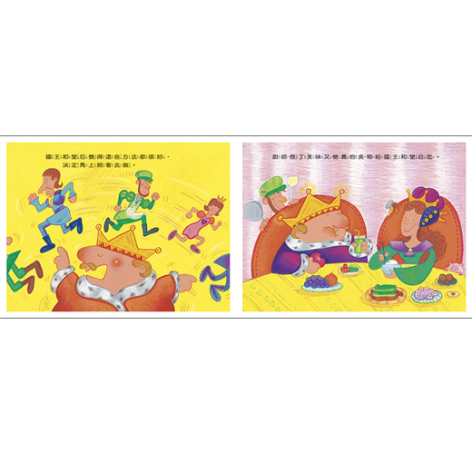 全書用色鮮豔,人物造型討喜、特色鮮明,書中還加入翻頁設計,製造懸疑及猜測的閱讀樂趣,請孩子翻一翻,看看胖國王最後減肥成功了嗎?比較國王減肥前後的身形差異;瞧瞧瘦皇后把國王的食物藏在哪裡?快跟著胖國王、瘦皇后,一掃身材過胖、過瘦的煩惱!