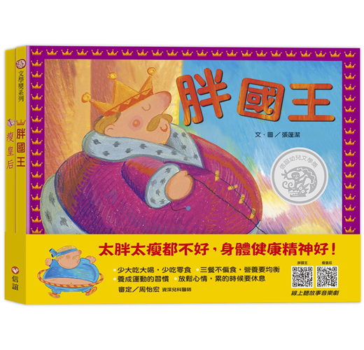 《胖國王.瘦皇后》以幽默輕鬆的故事,點出了飲食、生活習慣與身心健康有著密切關係,像是國王暴飲暴食又不運動,身體負擔大;皇后忙碌焦慮又偏食,身心壓力大等。「過胖」和「過瘦」不只是身材外型的問題,更會對身體健康帶來嚴重衝擊,是現代人必須重視的健康議題。故事中告訴孩子造成胖瘦的成因及影響,同時也提醒大家注意營養均衡、適量運動、睡眠充足,才能維持良好體態,擁有健康身心!