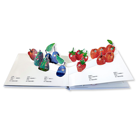 翻開《好餓的毛毛蟲立體洞洞書》,孩子們將看見太陽升起,毛毛蟲吃過的草莓、梨子、杯子蛋糕和棒棒糖等,全都跳脫平面,立起來了!還