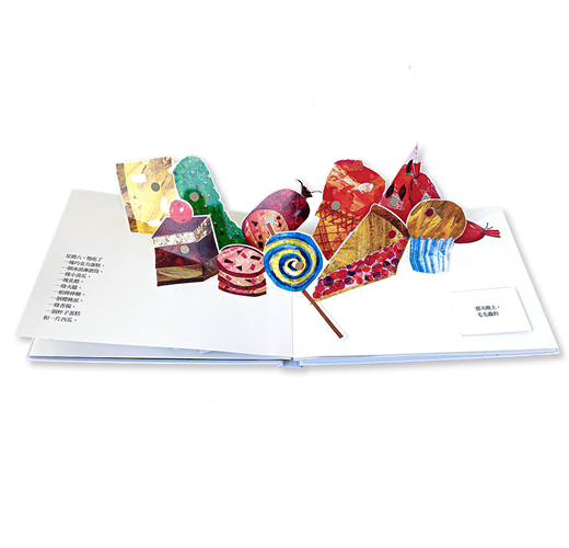 有被當成小房子的「繭」,以及變成蝴蝶後拍動翅膀的模樣也躍然眼前!除了立體畫面,孩子的手指也可以跟著毛毛蟲一同鑽進鑽出,探索這個充滿色彩與驚喜的奇妙世界。