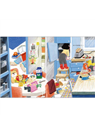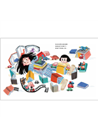 如果只讀文字,真是讓媽媽放一百二十個心,但──搭上圖畫,幾乎是育兒過程中的崩潰大全。畫面裡媽媽的觀點瞬間得到我的共鳴,實在好氣又好笑。一個披頭散髮、眼下烏青又燒得像顆蕃茄的媽媽,穿著睡衣,虛弱的躺在地上,動彈不得。小孩在一旁忙碌又周到的照顧媽媽,一刻不得閒:怕媽媽無聊,為媽媽念故事,用滿滿的玩具將媽媽圍繞;怕媽媽餓了,端出平日捨不得吃的巧克力、洋芋片、冰棒和餅乾給媽媽當午餐。廚房裡,小小的身影踩上高椅凳,翻箱倒櫃,倒牛奶、煮麵條彷彿前線戰場,看得我心跳漏了幾拍。