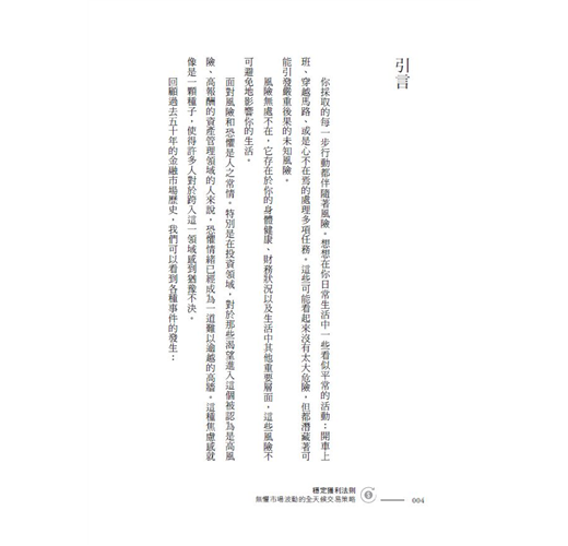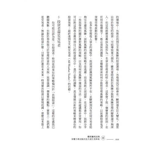 無論投資者的經驗或資金規模,「風險」始終是成功路上的巨大障礙。然而,湯姆‧貝索在《穩定獲利法則:無懼市場波動的全天候交易策略》中告訴我們,風險並非敵人,而是可以正面迎擊甚至轉化為利益的機會。他強調,投資成功的第一步在於改變對風險的思維,學會接受它並將其視為投資組合的助力。