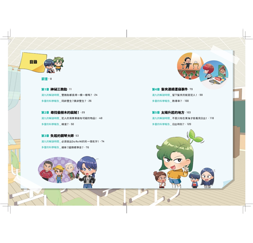 ✦每章節搭配一篇科學報告,全書總共包含五個不同的主題,包含同/異卵雙胞胎、緯度、國際標準音、熱導率、日出、日落與節氣等知識點。