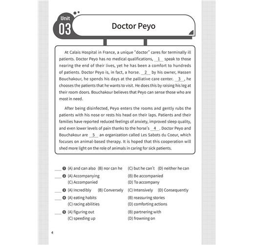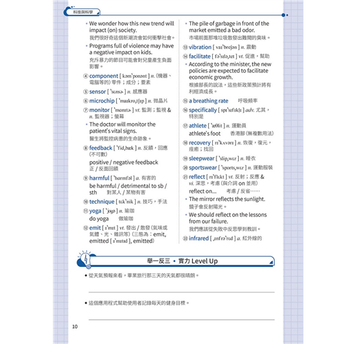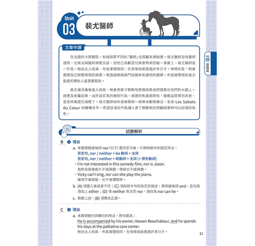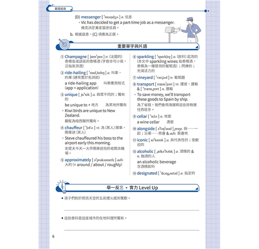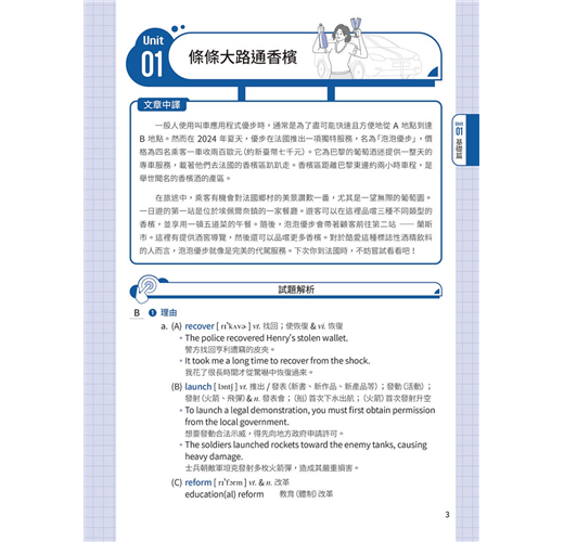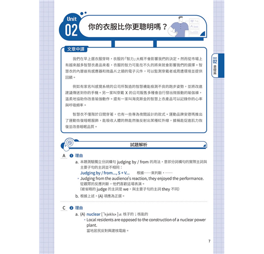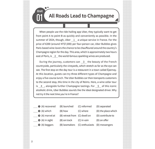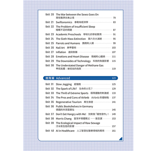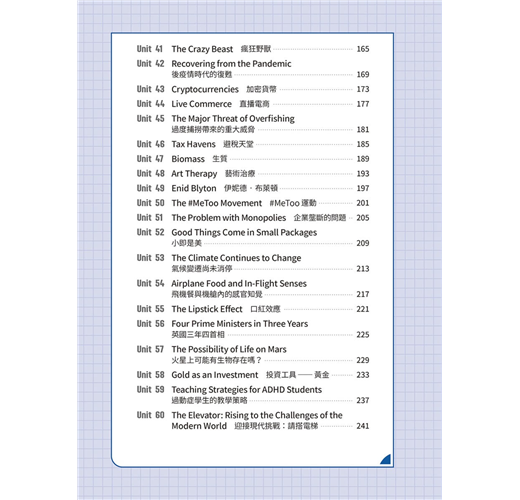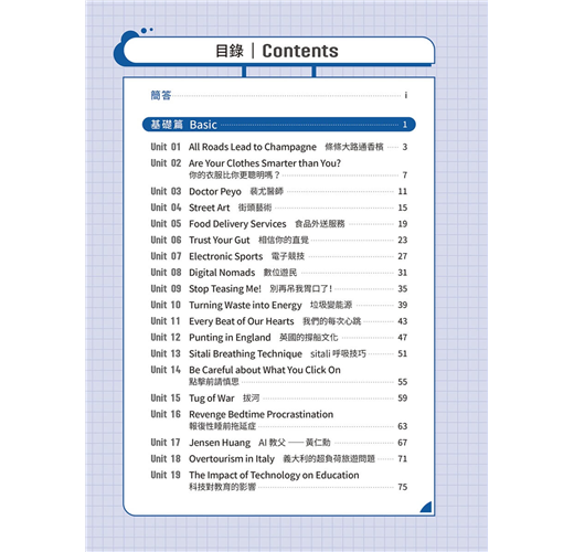 基礎篇 Basic Unit 01 All Roads Lead to Champagne Unit 02 Are Your Clothes Smarter than You? Unit 03 Doctor Peyo Unit 04 Street Art Unit 05 Food Delivery Services Unit 06 Trust Your Gut Unit 07 Electronic Sports Unit 08 Digital Nomads Unit 09 Stop Teasing Me! Unit 10 Turning Waste into Energy Unit 11 Every Beat of Our Hearts Unit 12 Punting in England Unit 13 Sitali Breathing Technique Unit 14 Be Careful about What You Click On Unit 15 Tug of War Unit 16 Revenge Bedtime Procrastination Unit 17 Jensen Huang Unit 18 Overtourism in Italy Unit 19 The Impact of Technology on Education Unit 20 The War between the Sexes Goes On Unit 21 Swiftonomics Unit 22 The Problem of Insufficient Sleep Unit 23 Academic Preschools Unit 24 The Sixth Mass Extinction Unit 25 Parrots and Humans Unit 26 Nail Art Unit 27 Inflation Unit 28 Emotions and Heart Disease Unit 29 The Downsides of Technology Unit 30 The Understated Danger of Methane Gas 進階篇 Advanced Unit 31 Slow Jogging Unit 32 The Spark of Life? Unit 33 The Thrill of Extreme Sports Unit 34 The Pros and Cons of Airbnb Unit 35 Regenerative Tourism Unit 36 Public Bookshelves in Germany Unit 37 Don’t Get Hangry with Me! Unit 38 Morris Chang Unit 39 The Ecological Impact of Raw Sewage Unit 40 AI in Healthcare Unit 41 The Crazy Beast Unit 42 Recovering from the Pandemic Unit 43 Cryptocurrencies Unit 44 Live Commerce Unit 45 The Major Threat of Overfishing Unit 46 Tax Havens Unit 47 Biomass Unit 48 Art Therapy Unit 49 Enid Blyton Unit 50 The #MeToo Movement Unit 51 The Problem with Monopolies Unit 52 Good Things Come in Small Packages Unit 53 The Climate Continues to Change Unit 54 Airplane Food and In-Flight Senses Unit 55 The Lipstick Effect Unit 56 Four Prime Ministers in Three Years Unit 57 The Possibility of Life on Mars Unit 58 Gold as an Investment Unit 59 Teaching Strategies for ADHD Students Unit 60 The Elevator: Rising to the Challenges of the Modern World