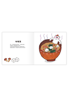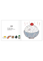 白飯、味噌湯、玉子燒、可樂餅、天婦羅丼飯、烏龍麵、義大利麵、壽司、肉包、關東煮、麵包、爆米花和麻糬,每道都非常誘人,在飯前閱讀這本繪本可以增加食慾,但是睡前閱讀的話可能會很危險……因為你會餓得受不了!