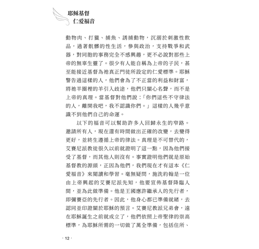 以下的福音可以幫助許多人回歸永生的窄路。邀請所有人,現在還有時間做出正確的改變,去變得更好,並終生遵循上帝的律法。真理是不可替代的,艾賽尼派教徒很久以前就證明了這一點,因為他們接受了基督,而其他人則沒有。事實證明他們就是原始基督教的源頭,正因為他們,我們現在才有這本《仁愛福音》來閱讀和學習。毫無疑問,施洗約翰是一位由上帝興起的艾賽尼派先知,他要宣佈基督降臨人間,並為此做準備。他是王國應許繼承人的先行者,即彌賽亞的先行者。因此,他身心都已準備就緒,去認同並印證關於耶穌的預言。艾賽尼教派兄弟會,遠在耶穌誕生之前就成立了,他們依照上帝聖律的崇高標準,為耶穌所需的一切做了萬全準備,包括住所、食物,以及正確的教育。如果沒有艾賽尼派教徒,我們今天就不會有任何福音,因為他們負責福音的原始書寫和精心保存。許多地方都有福音書副本的殘片,且在各地都有被發現。雖然過程很緩慢,但可以肯定的是,在不久的將來,我們會獲得關於耶穌的大部分著作。聖約翰這麼告訴我們:「關於耶穌的著作其實可以記滿很多卷冊,多到這世界都容納不下。」
