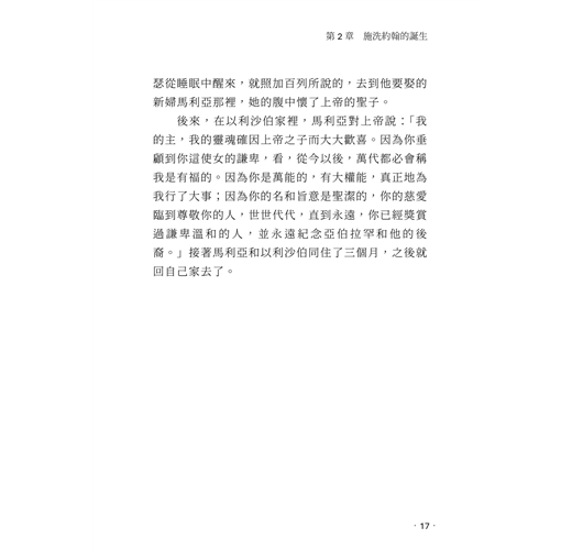 到了第六個月,上帝又差聖加百列往加利利的一個地方去,到一個名叫馬利亞的童女那裡,她已經被許配給大衛王家族中一個名叫約瑟的人。約瑟是一位聖潔且心地純良的人,精於木工和石匠的手藝。馬利亞溫柔善良、聰明伶俐,在主面前心懷謙卑。兩人在神面前都被宣告為良善聖潔;從他倆所生的就是耶穌,後來被稱為基督或彌賽亞。