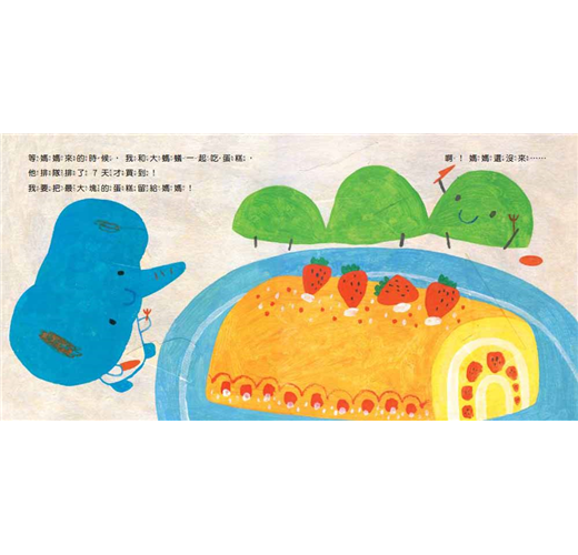 等媽媽來的時候, 我穿過了最危險的鱷魚池, 幫快遞哥哥準時送達包裹。 等媽媽來的時候, 我幫雜貨店把雞蛋送給雞蛋糕叔叔, 我送了5 次! 等媽媽來的時候, 我和一隻大螞蟻一起吃蛋糕, 他排隊排了七天才買到! 我要把最大塊的蛋糕留給媽媽吃! 啊!媽媽還沒來…… 啊!媽媽來了!