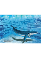 畫家李如青以細膩且富有情感的筆觸,同時展現深海的神祕與科技的冷冽。全書以藍色為基調,映襯海洋的浩瀚與鯨魚的孤獨。透過每一個細節,讀者彷彿能感受深海的流動與聲音的迴響。書中特別設計開門拉頁的全景鯨落場景,震撼呈現鯨魚生命最後的壯麗時刻,細膩描繪海洋生態的循環與永恆流轉。