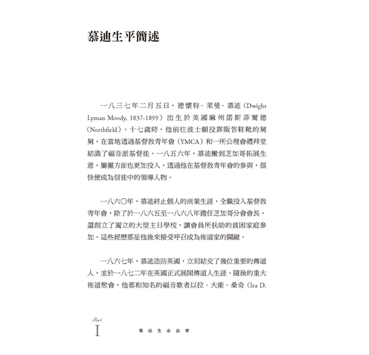 慕迪出身貧寒,原本是鞋店的推銷員,卻因著熱切回應神的呼召,渴求神的恩膏同在,終成就了非凡的佈道事工,見證了神是如何使用一個謙卑且單單為祂而活的人。
