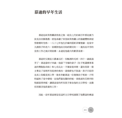 慕迪的父親是小農兼石匠,有酗酒的毛病,四十一歲就過世了,慕迪當時才四歲。他留下守寡的妻子(肚子裡還懷著慕迪的雙胞胎弟妹)和七名兒女,不僅家徒四壁,還有房貸。債主奪走了家裡所有能拿的東西,連柴薪也不放過,孩子只能待在床上取暖直...
