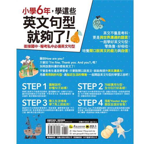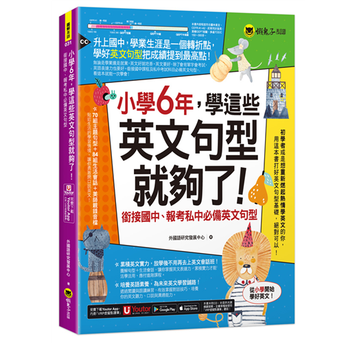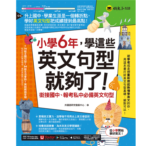聽到How are you?,只會回「I’m fine. Thank you. And you?」嗎?別再說教科書的樣板英文了!《小學6年,學這些英文句型就夠了》先拆解句子結構,帶你認識直述句、疑問句等各種句型,再帶你學習70組主題句型與生活會話,讓你掌握英文表達力,累積實力才能活學活用、應付進階課程。